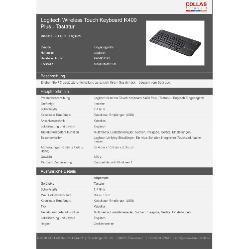 Jetzt anmeldenProduktinformationen "Logitech Wireless Touch Keyboard K400 Plus - Tastatur"