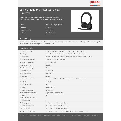 Jetzt anmeldenProduktinformationen "Logitech Zone 305 - Headset - On-Ear - Bluetooth"