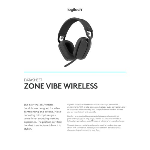 - Zone Vibe Wireless, ein kabelloses Over-Ear-Headset mit modernem Design und Komfort. Ausgestattet mit zwei Mikrofonen mit Geräuschunterdrückung bietet es eine hervorragende Audioqualität. Zuverlässige Verbindungen gewährleisten eine unterbrechungsfreie Meeting-Erfahrung.