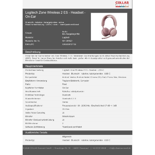 Produktinformationen "Logitech Zone Wireless 2 ES - Headset - On-Ear"