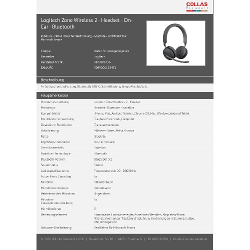 Jetzt anmeldenProduktinformationen "Logitech Zone Wireless 2 - Headset - On-Ear - Bluetooth"