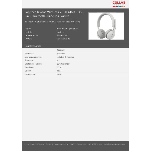 Jetzt anmeldenProduktinformationen "Logitech Zone Wireless 2 - Verkabelt & Kabellos - Büro/Callcenter - 230 g - Kopfhörer - Weiß"