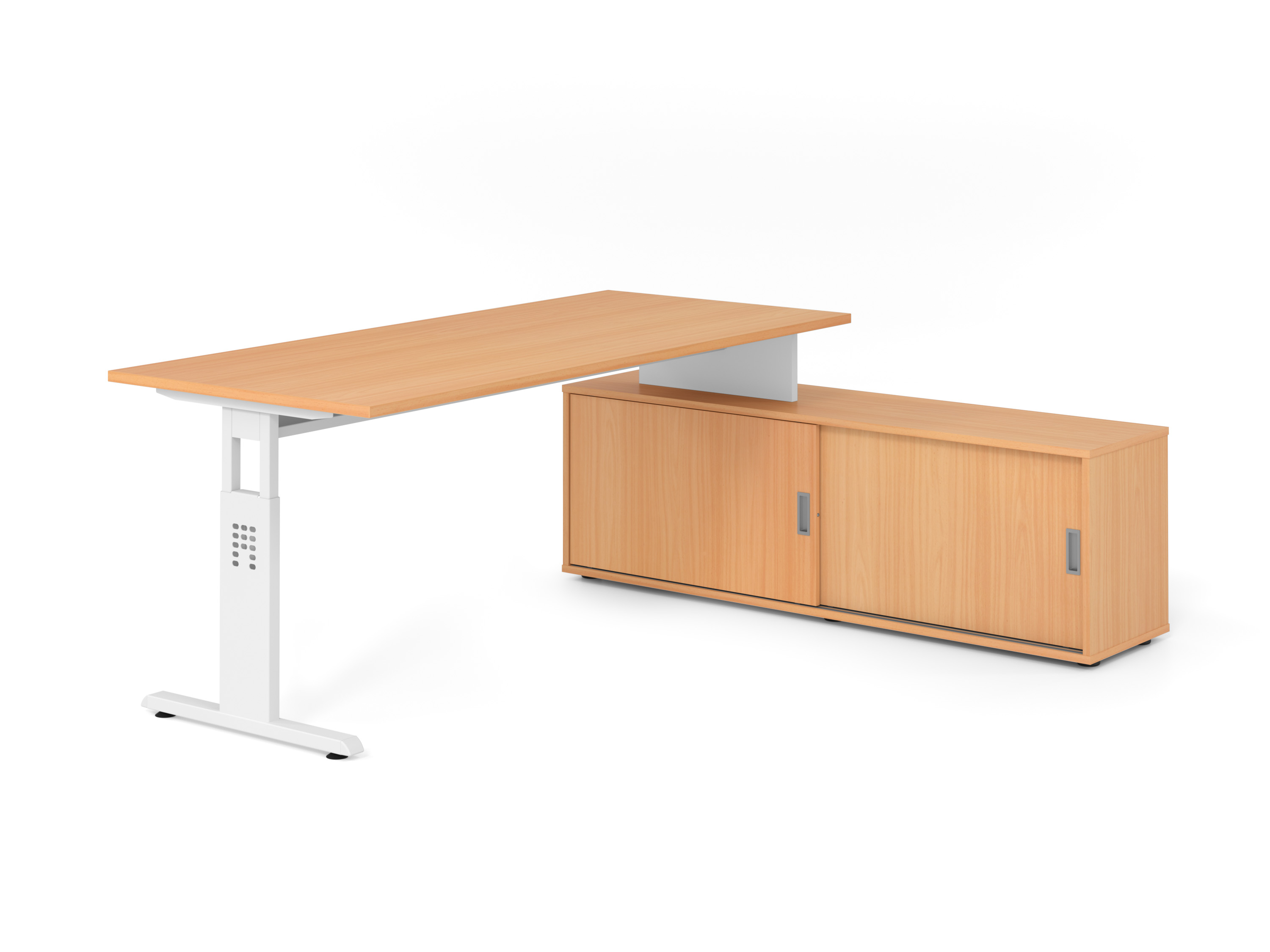 Aufsatz-Schreibtisch OSE19, 180x80cm;Platte: Buche, 25mm dick, ABS Dickkante;T-Fuß Gestell Weiß;Arbeitshöhe einstellbar auf 72cm, 75cm, 78cm;horizontale Kabelwanne, Querschnitt 9cm;vertikale Kabelführung im Fuß;Sideboard 1750S: 160x40x52cm (BxTxH);Korpus: Buche / Front: Buche;2 Schiebetüren 16mm, 8mm Sichtrückwand