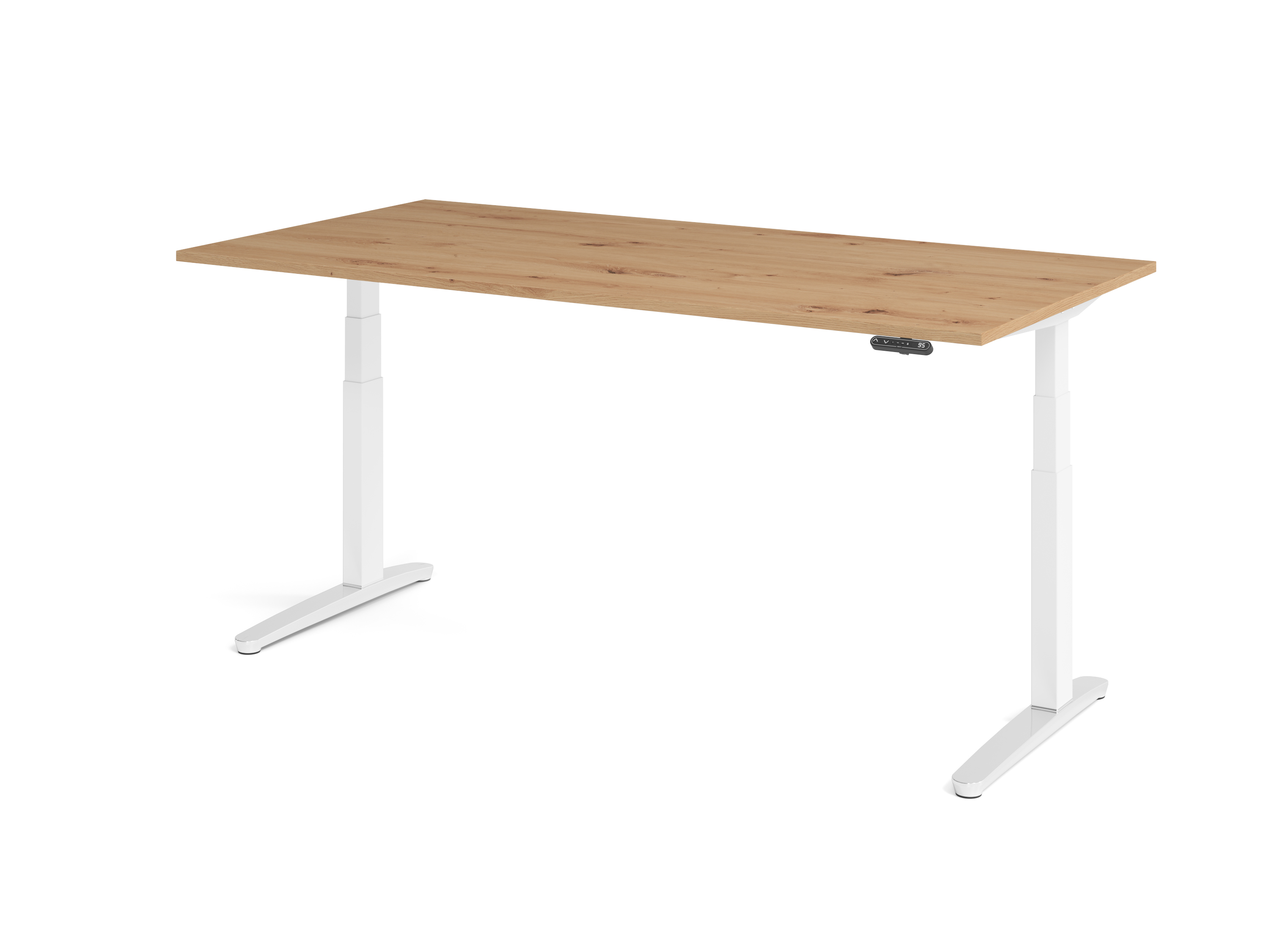Schreibtisch XBHM2E, 200 x 100 cm;Platte: Asteiche 25 mm dick, ABS Dickkante;Rechteckform;C-Fuß Gestell Weiß, Alu-Kufe poliert, mit;Memoryschalter, Arbeitshöhe 65 - 130 cm;elektrisch stufenlos höhenverstellbar;Elektroantrieb 2-stufig, 2 Motoren;Tragkraft 80 kg dynamisch, 120 kg statisch;Anlieferzustand: zerlegt, einfache Montage