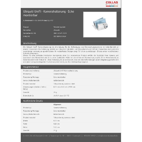 - Die Ubiquiti UniFi Kamerahalterung ist eine Lösung für die Befestigung von Überwachungskameras im Außenbereich an einem Eckstandort. Die Halterung besteht aus robustem Edelstahl und Polycarbonat und hält den Elementen stand, um eine zuverlässige Leistung zu gewährleisten. Ihr wetterfestes Design sorgt für einen zuverlässigen Einsatz unter verschiedenen Außenbedingungen.Dieses für eine einfache Installation konzipierte, über Eck montierbare Produkt erhöht die Stabilität Ihrer Kamera und maximiert den Blickwinkel, was es zu einer praktischen Wahl für eine effektive Überwachung macht. Ob im Wohnbereich, im Gewerbe oder in der Industrie - diese Halterung ist so konstruiert, dass sie den Anforderungen jeder Umgebung gerecht wird und gleichzeitig ein elegantes Erscheinungsbild bietet, das Ihre Außenanlage ergänzt.