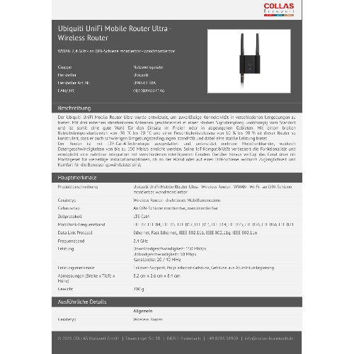 - Der Ubiquiti UniFi Mobile Router Ultra wurde entwickelt, um zuverlässige Konnektivität in verschiedenen Umgebungen zu bieten. Mit drei externen abnehmbaren Antennen gewährleistet er einen starken Signalempfang unabhängig vom Standort und ist somit eine gute Wahl für den Einsatz im Freien oder in abgelegenen Gebieten. Mit einem breiten Betriebstemperaturbereich von -30 °C bis 70 °C und einer Feuchtigkeitstoleranz von 10 % bis 90 % ist dieser Router so konstruiert, dass er auch schwierigen Umgebungsbedingungen standhält und dabei eine stabile Leistung bietet.Der Router ist mit LTE-Cat-4-Technologie ausgestattet und unterstützt mehrere Mobilfunkbänder, wodurch Datengeschwindigkeiten von bis zu 150 Mbit/s erreicht werden. Seine IoT-Kompatibilität verbessert die Funktionalität und ermöglicht eine nahtlose Integration mit verschiedenen intelligenten Geräten. Darüber hinaus verfügt das Gerät über ein Montageset für vielseitige Installationsoptionen, ob an der Wand oder auf einer DIN-Schiene, wodurch Zugänglichkeit und Komfort für die Benutzer gewährleistet sind.