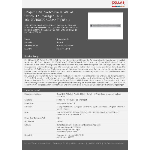 - Der Ubiquiti UniFi Switch Pro XG 48 PoE ist eine robuste Netzwerklösung, die für anspruchsvolle Umgebungen entwickelt wurde. Mit 48 Ports, darunter 32 10/100/1000/2,5G/5G/10GBase-T (PoE++) und 16 10/100/1000/2,5GBase-T (PoE++), unterstützt dieser Switch umfangreiche Netzwerkfunktionen. Mit einer Weiterleitungsrate von 684 Mpps und einem nicht blockierenden Switching-Durchsatz von 920 Gbps kann er hohen Datenverkehr ohne Leistungseinbußen bewältigen. Das integrierte 1,3-Zoll-Touchscreen-Display verbessert die Benutzererfahrung und sorgt für eine nahtlose Netzwerkverwaltung. Darüber hinaus ermöglicht ein PoE-Budget von 1080 W vielseitige Stromversorgungsoptionen und gewährleistet einen optimalen Betrieb der angeschlossenen Geräte.Der Ubiquiti UniFi Switch Pro XG 48 PoE wurde mit Blick auf operative Flexibilität entwickelt und kann bei Temperaturen von -5 °C bis 40 °C und einer Luftfeuchtigkeit von bis zu 90 % effizient betrieben werden. Funktionen wie Port-Spiegelung, DHCP-Snooping, Quality of Service (QoS) und Unterstützung für Inter-VLAN-Routing bieten erweiterte Funktionalität und sichere Netzwerkkonfigurationen. Darüber hinaus gewährleistet die Einhaltung der erforderlichen Standards wie IC, FCC und NDAA die Konformität mit den gesetzlichen Anforderungen und ermöglicht einen zuverlässigen Einsatz in verschiedenen Umgebungen.