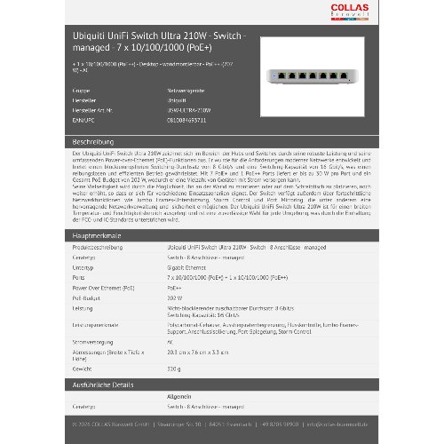 Jetzt anmeldenProduktinformationen "Ubiquiti UniFi Switch Ultra 210W - Switch - managed - 7 x 10/100/1000 (PoE+)"