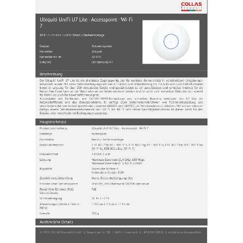 Jetzt anmeldenProduktinformationen "Ubiquiti UniFi U7 Lite - Accesspoint - Wi-Fi 7"