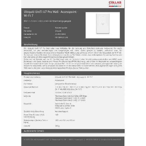 Jetzt anmeldenProduktinformationen "Ubiquiti UniFi U7 Pro Wall - Accesspoint - Wi-Fi 7"