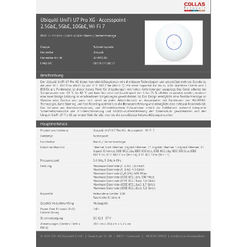 Jetzt anmeldenProduktinformationen "Ubiquiti UniFi U7 Pro XG - Accesspoint - 2.5GbE, 5GbE, 10GbE, Wi-Fi 7"